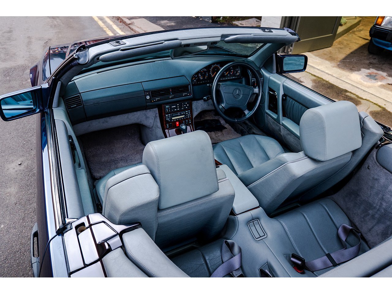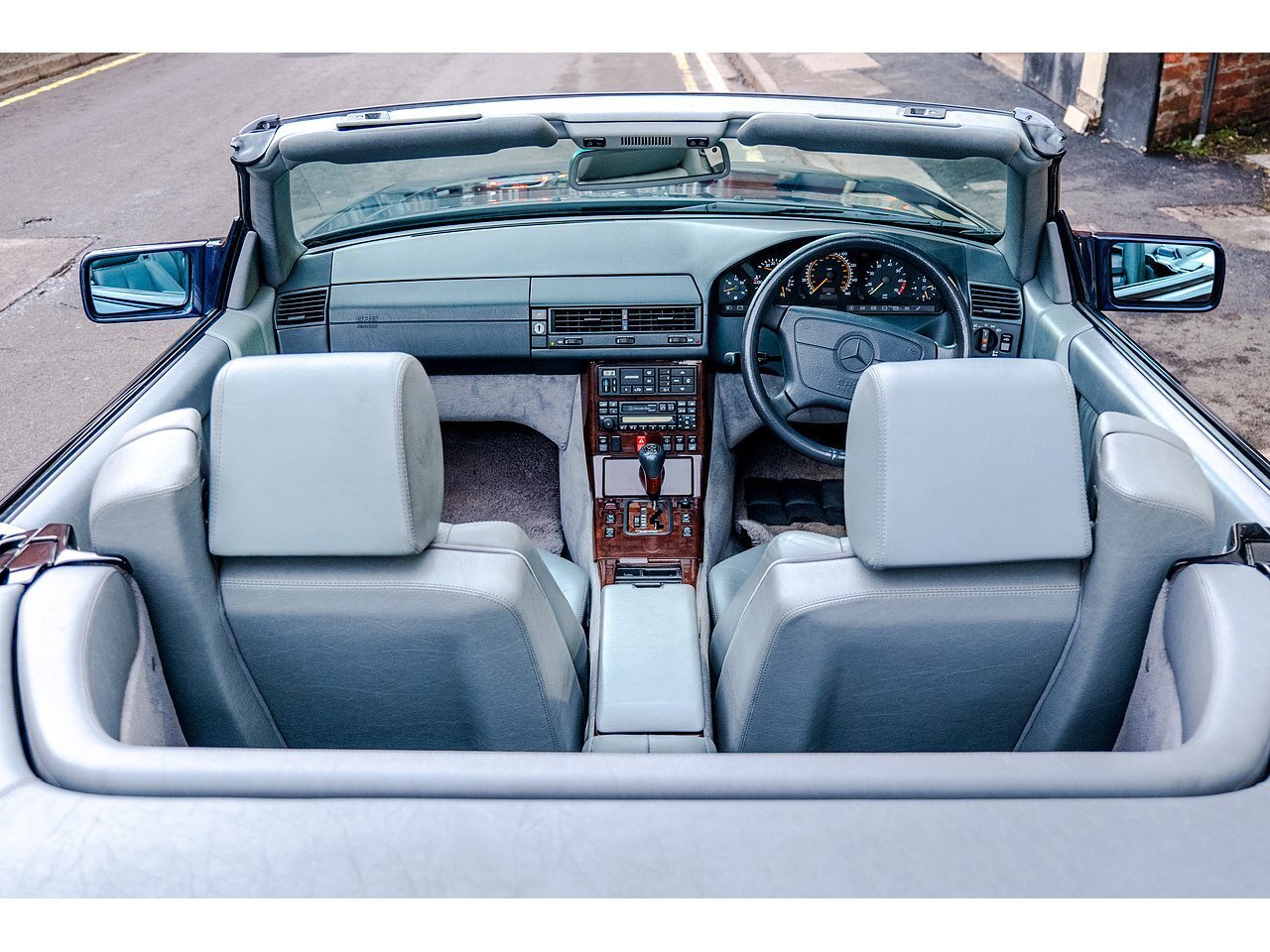The exterior presents extremely well, the metallic blue paintwork suiting the timeless R129 lines beautifully. Panel fit and stance are exactly as they should be, sitting on correct factory alloy wheels, while the navy blue fabric hood complements the car perfectly and completes the understated, period-correct look.