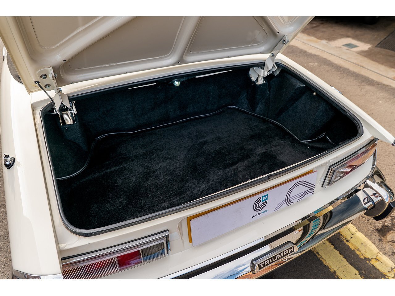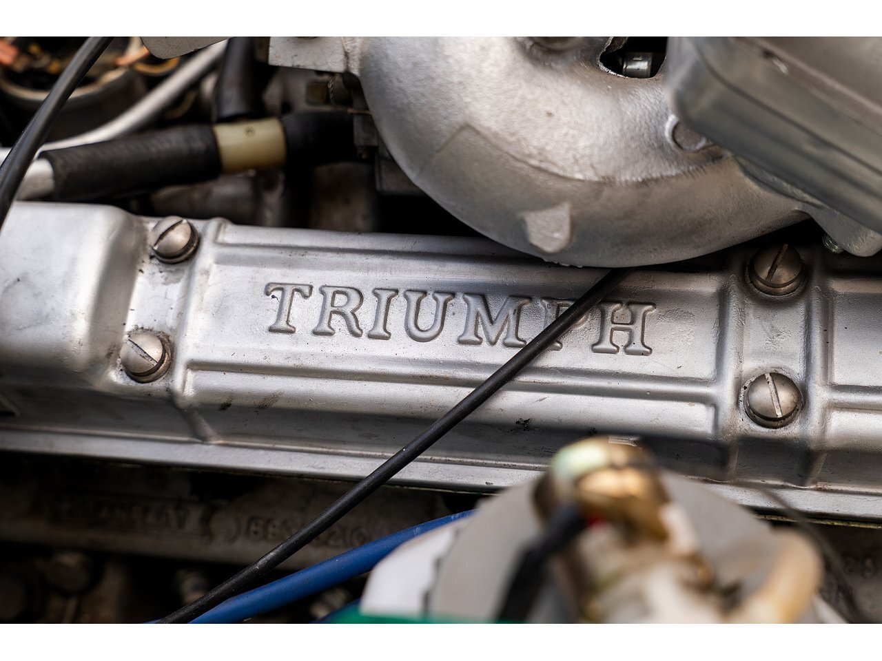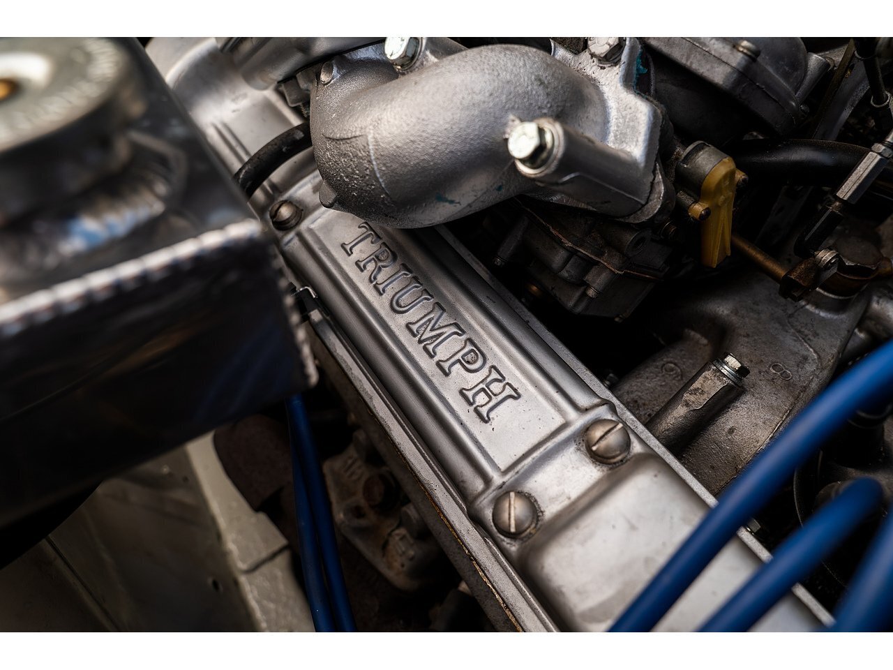 Under the bonnet sits Triumph’s 3.0-litre V8, mated to a manual gearbox with overdrive for relaxed long-distance cruising. The restoration included sensible and discreet upgrades such as an alloy header tank for improved cooling durability, electronic ignition for reliable starting and running, and a Revotec electric fan to ensure consistent cooling in modern traffic conditions.