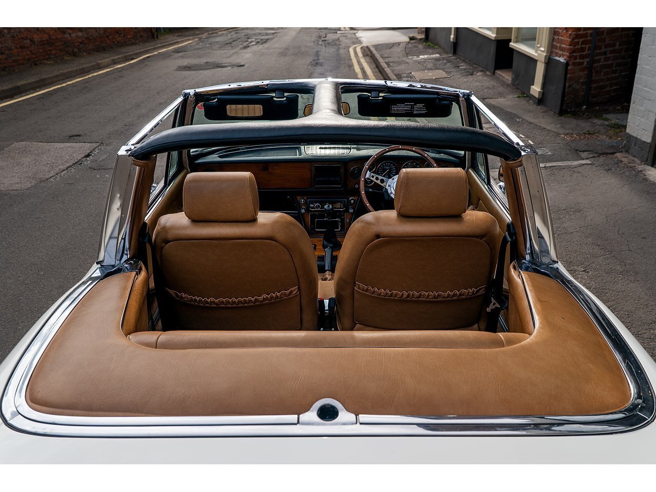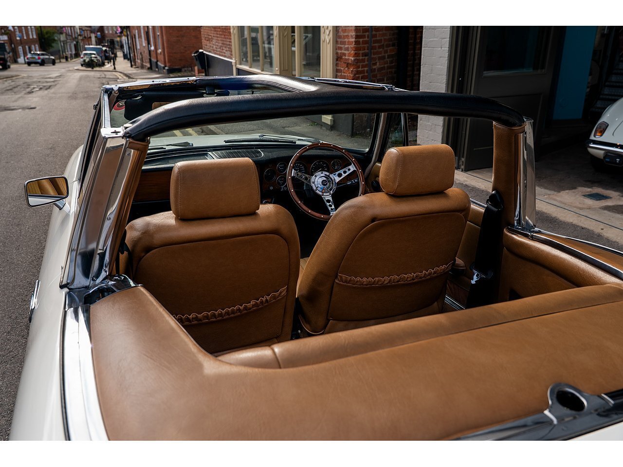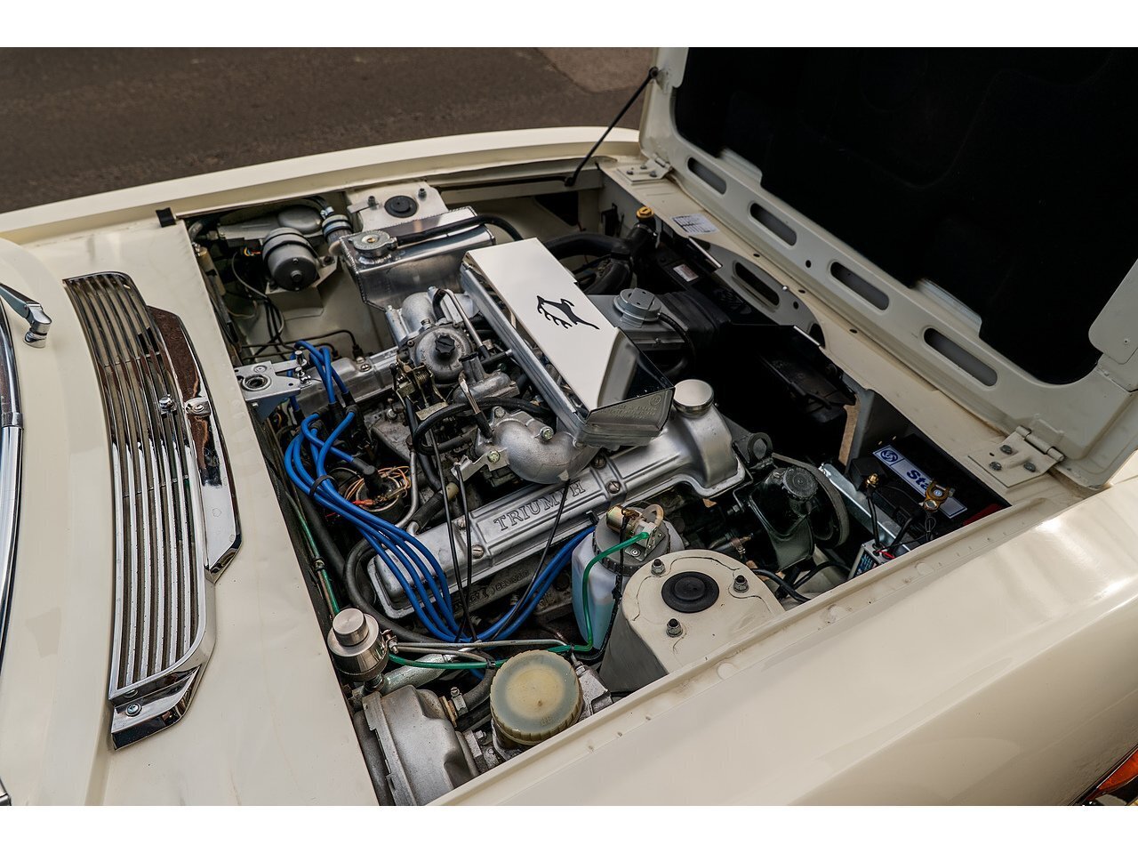 Under the bonnet sits Triumph’s 3.0-litre V8, mated to a manual gearbox with overdrive for relaxed long-distance cruising. The restoration included sensible and discreet upgrades such as an alloy header tank for improved cooling durability, electronic ignition for reliable starting and running, and a Revotec electric fan to ensure consistent cooling in modern traffic conditions.
